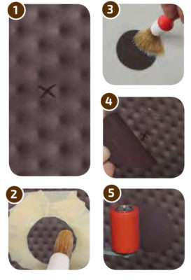 Wenn du eine schadhafte Stelle in deiner TAMI Dogbox entdeckst, aus der Luft entweicht, so kannst du das sehr einfach reparieren. Nimm hierfür einen der Patches aus dem Reparaturset und schneide ihn gegebenenfalls für die Größe der schadhaften Stelle zu. Leg ihn auf die schadhafte Stelle und umfahre ihn mit einem Bleistift. Klebe mit einem Abdeckband den Bereich außerhalb der Bleistiftlinie ab. Mit einem kleinen Pinsel kannst du den Klebstoff (z.b. Spezial technicoll® Kleber) sowohl auf den Schadstellenbereich als auch auf den Patch auftragen und dann die Abdeckbänder abziehen. Für eine gute Verklebung presse den Patch fest auf den Untergrund. Benutze dazu eine Anpressrolle oder ähnliches.