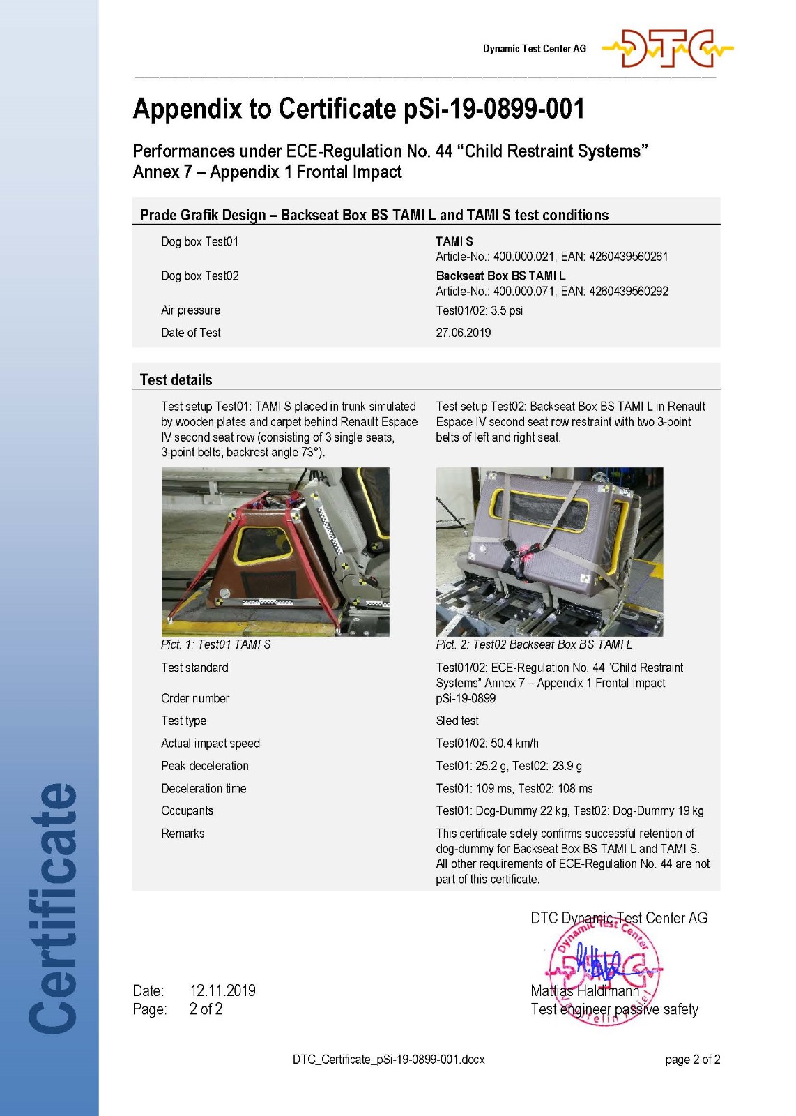 Nous avons effectué un crash test complet au DTC – Dynamic Test Center en Suisse ( https://www.dtc-ag.ch/ Ici, nous avons simulé une structure typique, un coffre TAMI derrière la banquette arrière et un coffre arrière TAMI sur une banquette arrière en trois parties. Des mannequins pesant environ 20 ou 23 kg ont été utilisés à une vitesse de 50 km/h.