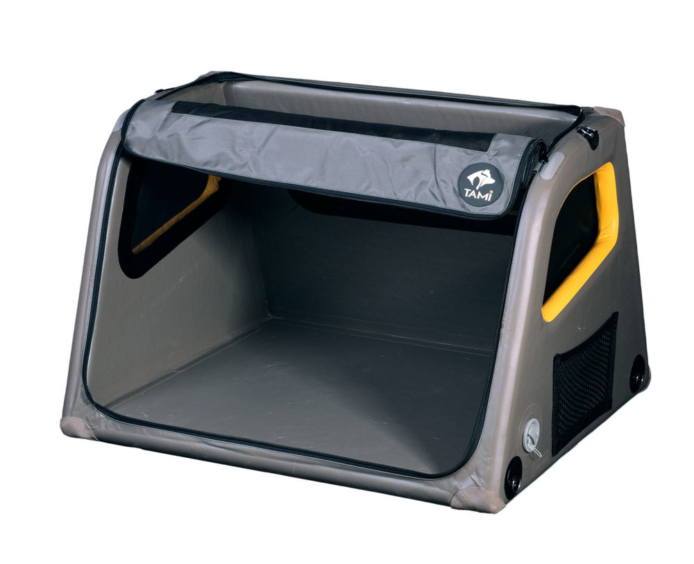Il box per cani TAMI è pieghevole e si gonfia in pochi secondi. Con le sue pareti gonfiabili (cuscini d'aria spessi 4 cm), offre una funzione airbag attraverso una protezione dagli urti completa.